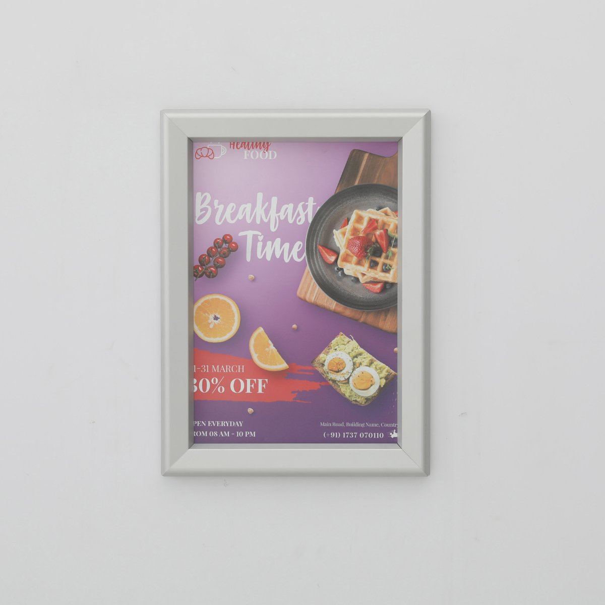 Ovaj klik aluminijumski ram srebrne boje služi za izlaganje postera različitih veličina. Alu okvir za grafiku, poznat i kao ram za postere, pruža odličan način za prikazivanje fotografija, slika i reklama. Ovaj metalni okvir ima četiri ravne ivice koje se lako otvaraju i zatvaraju. Jednostavno otvorite ram, ubacite štampu, a zatim zatvorite. Ram je sa tankim profilom i mat završnom obradom. Jasna PVC folija bez odsjaja se stavlja preko postera i štiti grafiku od oštećenja. Poleđina svakog rama izrađena je od plastike. Ovaj klik ram može se montirati vertikalno ili horizontalno, u zavisnosti od vaših potreba.