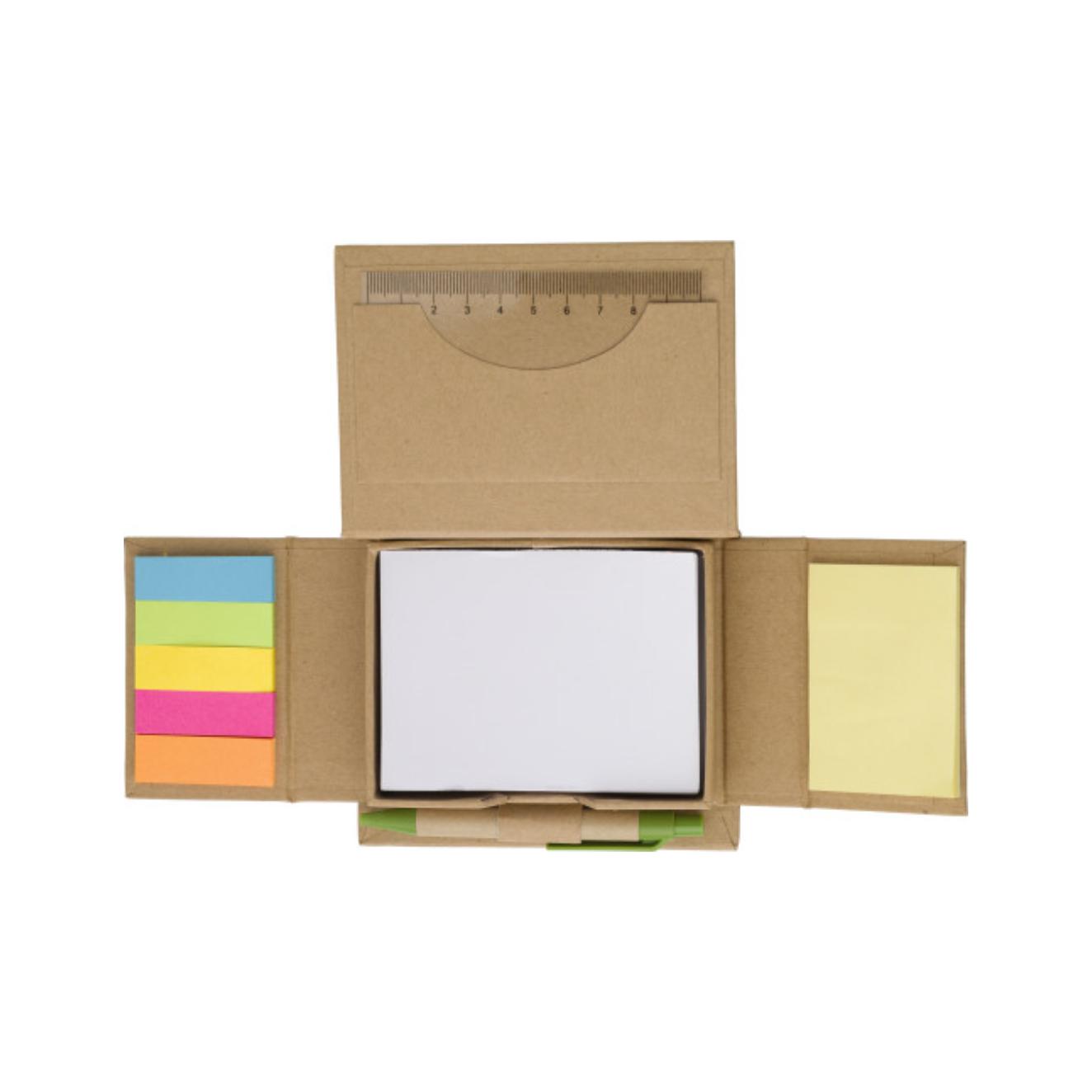 Kartonski držač za beleške, uključujući plastični lenjir u poklopcu, 150 lepljivih beleški, blok za beleške od 160 praznih listova i petlju za olovku sa hemijskom olovkom, plavo mastilo.