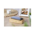 Bežični punjač od bambusa od 5V, sa integrisanim LED ekranom sata sa belim svetlom. Punjač ima mikro USB port. Dugmad na dnu za podešavanje vremena. Uključujući kablove i baterije.