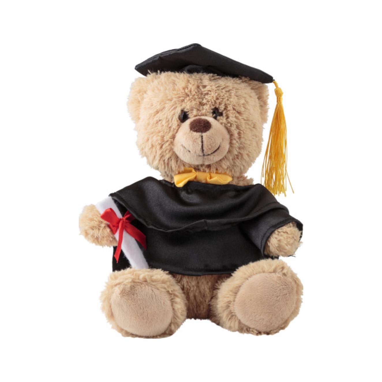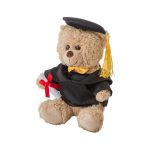 Plišani maturantski medved sa šeširom i ogrtačem od poliestera sa svilenim osećajem. Diplomski papir u ruci. Uključujući ušnu markicu za štampanje.